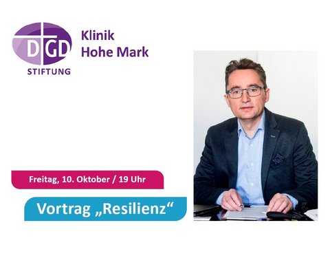 "Was macht uns in schweren Zeiten stark?" Schmid ist Pastor, Resilienz-Experte und individualpsychologischer Berater. In einer Lebenskrise war er vor 15 Jahren selbst Patient in der DGD Klinik Hohe Mark und berichtet auch, was ihm in seinen persönlichen "stürmischen Zeiten" am meisten geholfen hat. Der Vortrag beginnt am Freitag, 10. Oktober, um 19 Uhr. Der Eintritt ist frei – alle Interessierten sind herzlich eingeladen!